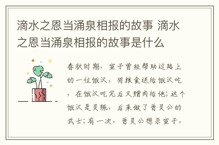 春秋时期,宣子曾经帮助过路上的一位饿汉,将粮食送给饿汉吃,在饿汉吃完后又赠肉给他;这个饿汉是灵辄,后来做了晋灵公的武士;有一次,晋灵公想杀宣子,灵辄拦住了晋灵公的手下,帮助宣子逃脱;宣子询问灵辄为何要帮他,灵辄告诉宣子他是当初那个饿汉;宣子又问灵辄的姓名和住所,灵辄不告而退。