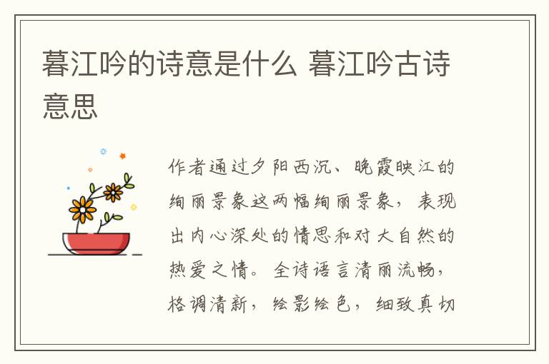 作者通过夕阳西沉、晚霞映江的绚丽景象这两幅绚丽景象,表现出内心深处的情思和对大自然的热爱之情。全诗语言清丽流畅,格调清新,绘影绘色,细致真切,其写景之微妙,历来备受称道。