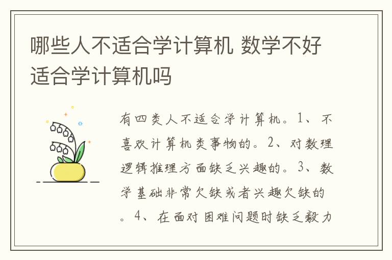有四类人不适合学计算机。1、不喜欢计算机类事物的。2、对数理逻辑推理方面缺乏兴趣的。3、数学基础非常欠缺或者兴趣欠缺的。4、在面对困难问题时缺乏毅力与耐心的。计算机专业是指计算机硬件与软件相结合、面向系统、更偏向应用的宽口径专业。对于没有兴趣的人来说,学起来会比较枯燥。