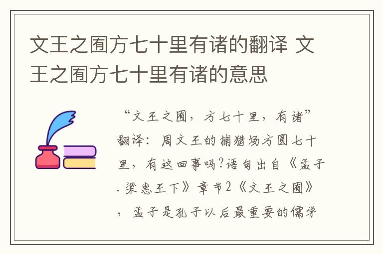 “文王之囿,方七十里,有诸”翻译:周文王的捕猎场方圆七十里,有这回事吗?语句出自《孟子.梁惠王下》章节2《文王之囿》,孟子是孔子以后最重要的儒学大师,他继承和发展了孔子的学说,后世尊之为“亚圣”。本篇文章反映了孟子“民贵君轻”的著名论点。