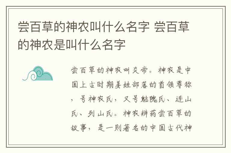 尝百草的神农叫炎帝。神农是中国上古时期姜姓部落的首领尊称,号神农氏,又号魁隗氏、连山氏、列山氏。神农辨药尝百草的故事,是一则著名的中国古代神话传说。神农氏本是三皇之一。有一次他见鸟儿衔种,由此发明了五谷农业,因为这些卓越的贡献,大家又称他为神农。
