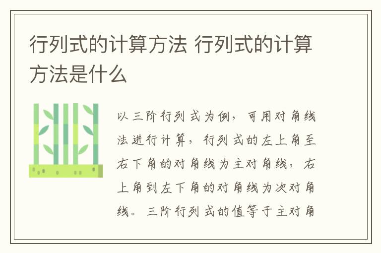 行列式的计算方法:以三阶行列式为例,可用对角线法进行计算,行列式的左上角至右下角的对角线为主对角线,右上角到左下角的对角线为次对角线。三阶行列式的值等于主对角线的三个数的积与和主对角线平行的对角线上的三个数的积的和减去次对角线的三个数的积与和次对角线平行的对角线上三个数的积的和的差。