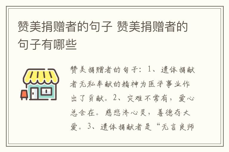赞美捐赠者的句子:1、遗体捐献者无私奉献的精神为医学事业作出了贡献。2、灾难不常有,爱心总会在。慈悲济心灵,善德存大爱。3、遗体捐献者是“无言良师”,又到一年清明时,致敬每一位遗体捐献者!