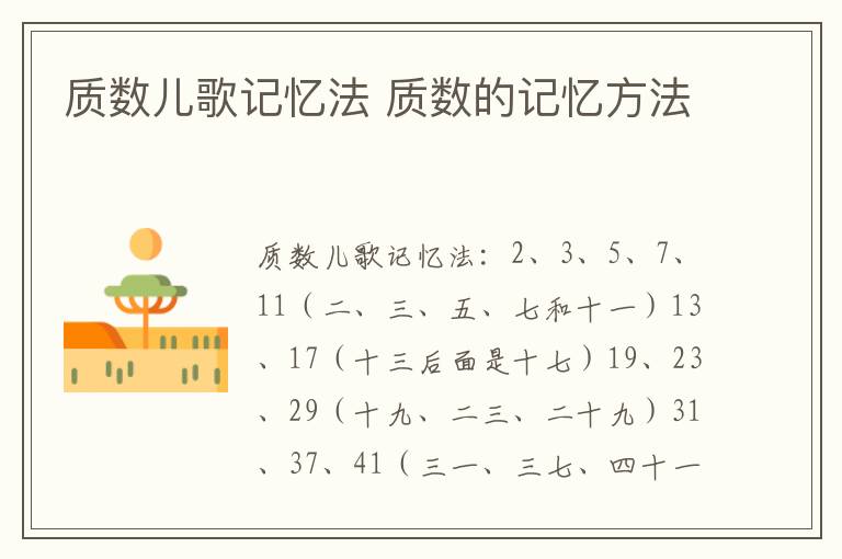 质数儿歌记忆法:2、3、5、7、11(二、三、五、七和十一)13、17(十三后面是十七)19、23、29(十九、二三、二十九)31、37、41(三一、三七、四十一)43、47、53(四三、四七、五十三)59、61、67(五九、六一、六十七)71、73、79(七一、七三、七十九)83、89、97(八三、八九、九十七)。