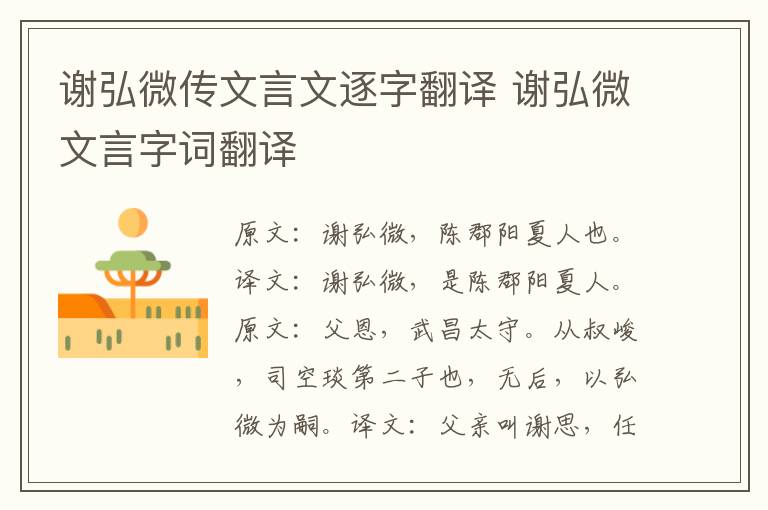 原文:谢弘微,陈郡阳夏人也。译文:谢弘微,是陈郡阳夏人。原文:父恩,武昌太守。从叔峻,司空琰第二子也,无后,以弘微为嗣。译文:父亲叫谢思,任武昌太守。堂叔谢峻是司空谢琰的第二个儿子。谢峻自己无子,就以谢弘微为继子。