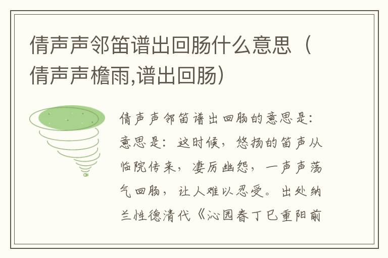 倩声声邻笛谱出回肠的意思是:意思是:这时候,悠扬的笛声从临院传来,凄厉幽怨,一声声荡气回肠,让人难以忍受。出处纳兰性德清代《沁园春丁巳重阳前》,重寻碧落茫茫。料短发、朝来定有霜。便人间天上,尘缘未断,春花秋叶,触绪还伤。欲结绸缪,翻惊摇落,减尽荀衣昨日香。