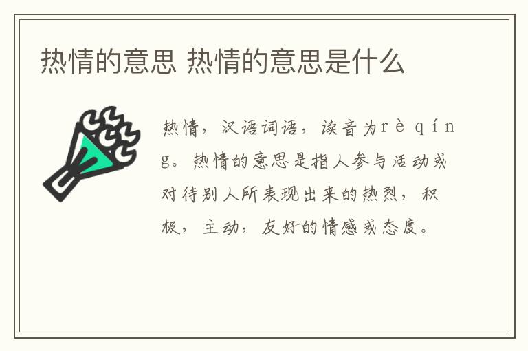 热情的意思 热情的意思是什么 知识分享 10月1日 编辑 童画 取消关注 关注 私信 热情,汉语词语,读音为rèqíng。热情的意思是指人参与活动或对待别人所表现出来的热烈,积极,主动,友好的情感或态度。词语出自《孽海花》第三二回:“我们俩的结合,本是一种热情的结合。” 热情的近义词有:亲密、热忱、亲切、关切 反义词有:冷落、冷漠、冷傲、淡漠 词语造句:她工作热情,服务周到,受到人们的好评。 No related posts. 本文内容由互联网用户自发贡献,该文观点仅代表作者本人。本站仅提供信息存储空间服务,不拥有所有权,不承担相关法律责任。如发现本站有涉嫌抄袭侵权/违法违规的内容, 请发送邮件至 2245678901@qq.com 举报,一经查实,本站将立刻删除。 给TA打赏 共{{data.count}}人 人已打赏