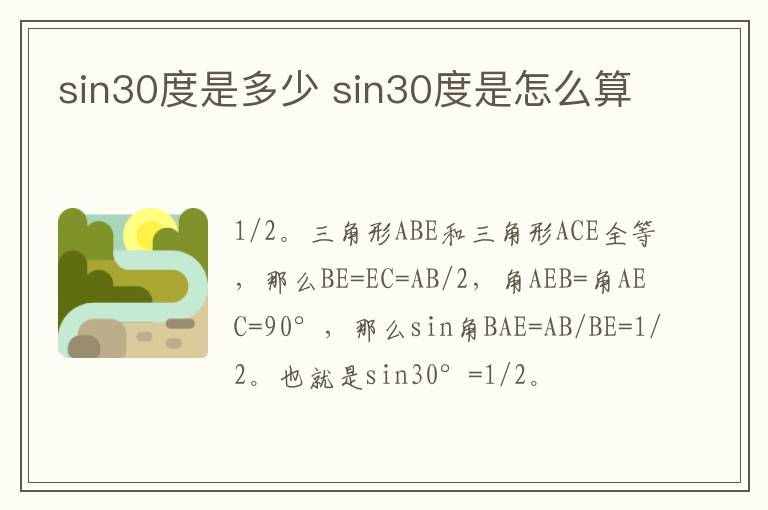 sin30度等于二分之一。首先等边三角形ABC的三个角都是60°,从A画一条平分线与BC相较于E,那么三角形ABE和三角形ACE之间AB=AC,AE是公共边,角BAE=角CAE=30°。所以三角形ABE和三角形ACE全等,那么BE=EC=AB/2,角AEB=角AEC=90°,那么sin角BAE=AB/BE=1/2。也就是sin30°=1/2。