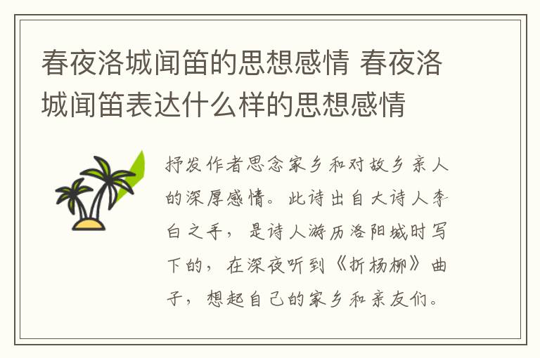 抒发作者思念家乡和对故乡亲人的深厚感情。此诗出自大诗人李白之手,是诗人游历洛阳城时写下的,在深夜听到《折杨柳》曲子,想起自己的家乡和亲友们。