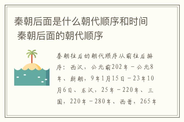 秦朝往后的朝代顺序从前往后排序:西汉,公元前202年-公元8年、新朝,9年1月15日-23年10月6日、东汉,25年-220年、三国,220年-280年、西晋,265年—317年、东晋,317年—420年、十六国,304年—439年、南北朝,420年—589年。