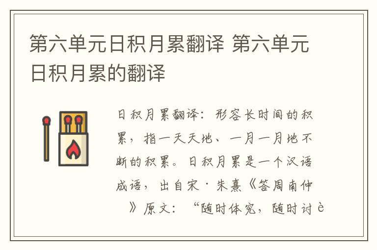 日积月累翻译:日积月累是一个汉语成语,出自宋·朱熹《答周南仲书》原文:“随时体究,随时讨论,但使一日之间整顿得三五次,理会得三五事,则日积月累,自然纯熟,自然光明矣。”
