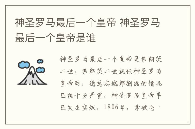 神圣罗马最后一个皇帝是弗朗茨二世,弗郎茨二世就任神圣罗马皇帝时,德意志城邦割据的情况已经十分严重,神圣罗马皇帝早已失去实权。1806年,拿破仑·波拿巴解散了神圣罗马帝国。弗郎茨二世被迫以和亲的方式,把女儿玛丽亚·路易莎嫁给拿破仑·波拿巴。