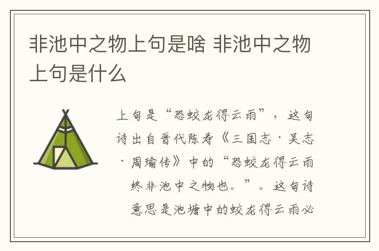 “非池中之物”的上句是“恐蛟龙得云雨”,这句诗出自晋代陈寿《三国志·吴志·周瑜传》中的“恐蛟龙得云雨,终非池中之物也。”。