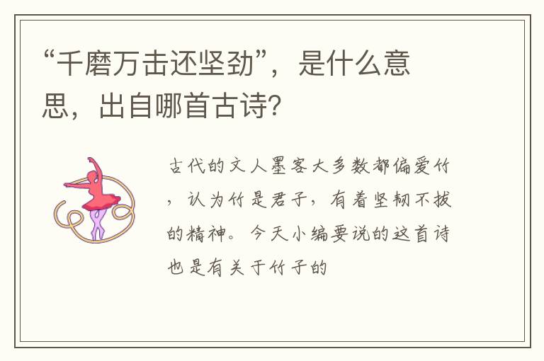 古代的文人墨客大多数都偏爱竹,认为竹是君子,有着坚韧不拔的精神。今天小编要说的这首诗也是有关于竹子的,其中有一句诗是“千磨万击还坚劲”,这是什么意思呢?让我们一起来看看吧。