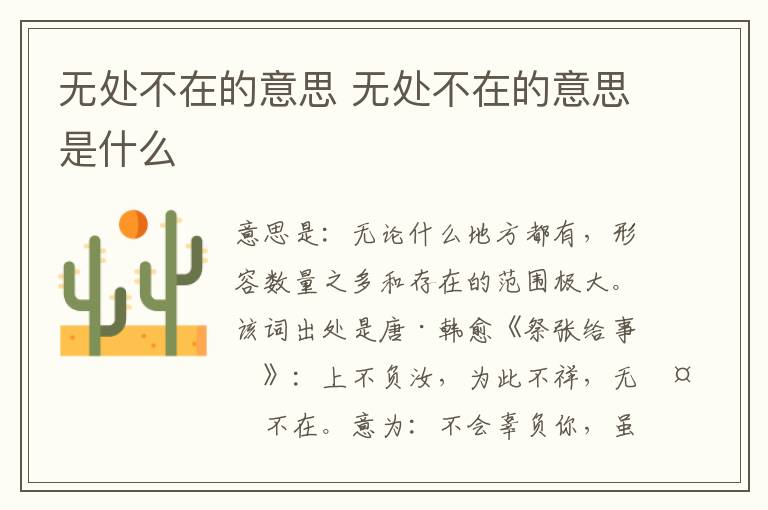 无处不在的意思是:无论什么地方都有,形容数量之多和存在的范围极大。日常中做谓语和定语出现在语句中,该词出处是唐·韩愈《祭张给事文》:上不负汝,为此不祥,无处不在。(白话文:不会辜负你,虽然到处都存在这件很不祥的事。)