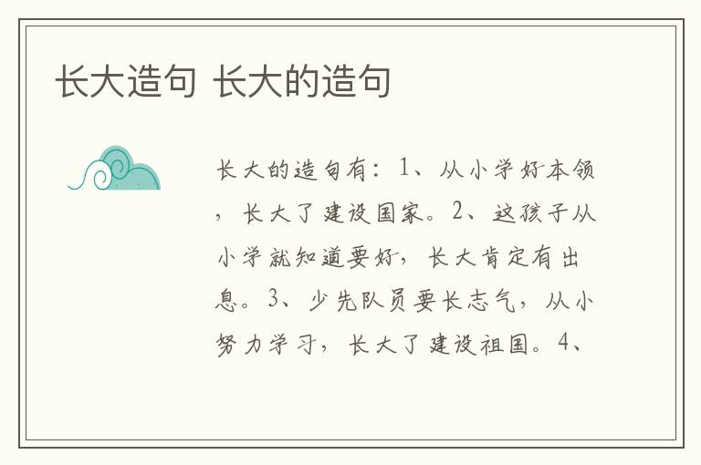 长大的造句有:1、从小学好本领,长大了建设国家。2、这孩子从小学就知道要好,长大肯定有出息。3、少先队员要长志气,从小努力学习,长大了建设祖国。4、我长大了要做个旅行家,周游五湖四海。
