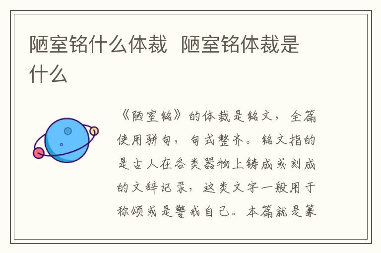 《陋室铭》的体裁是铭文,全篇使用骈句,句式整齐。铭文指的是古人在各类器物上铸成或刻成的文辞记录,这类文字一般用于称颂或是警戒自己。本篇就是篆刻于作者陋室前的石碑上的铭文,以陋室之名来歌颂德行,警戒自己要坚守节操。