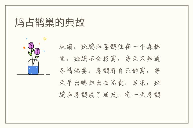 从前,斑鸠和喜鹊住在一个森林里。斑鸠不会搭窝,每天只知道尽情玩耍。喜鹊有自己的窝,每天早出晚归出去觅食。后来,斑鸠和喜鹊成了朋友。有一天喜鹊邀请斑鸠去她家做客,斑鸠痛快的答应了。就这样,一来二去,斑鸠成了喜鹊家的常客。