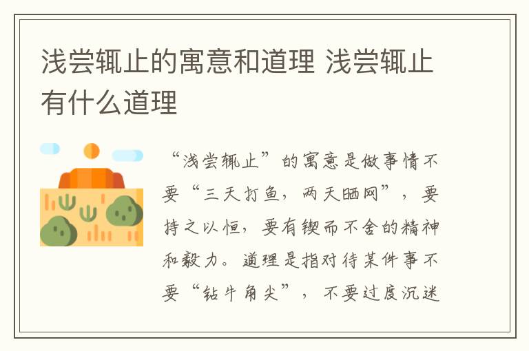 “浅尝辄止”的寓意是做事情不要“三天打鱼,两天晒网”,要持之以恒,要有锲而不舍的精神和毅力;道理是指对待某件事不要“钻牛角尖”,不要过度沉迷,要恰到好处。“浅尝辄止”本意是指略微尝试一下就停下来;也指不深入钻研;又指博学但是不精通。