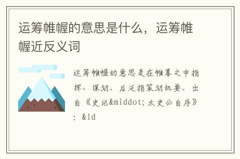 运筹帷幄的意思是在帷幕之中指挥、谋划。后泛指策划机要。出自《史记·太史公自序》:“运筹帷幄之中,制胜于无形,子房计谋其事,无知名,无勇功,图难于易,为大于细。”