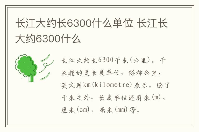 长江大约长6300千米(公里)。千米指的是长度单位,俗称公里,英文用km(kilometre)表示。除了千米之外,长度单位还有米(m)、厘米(cm)、毫米(mm)等。