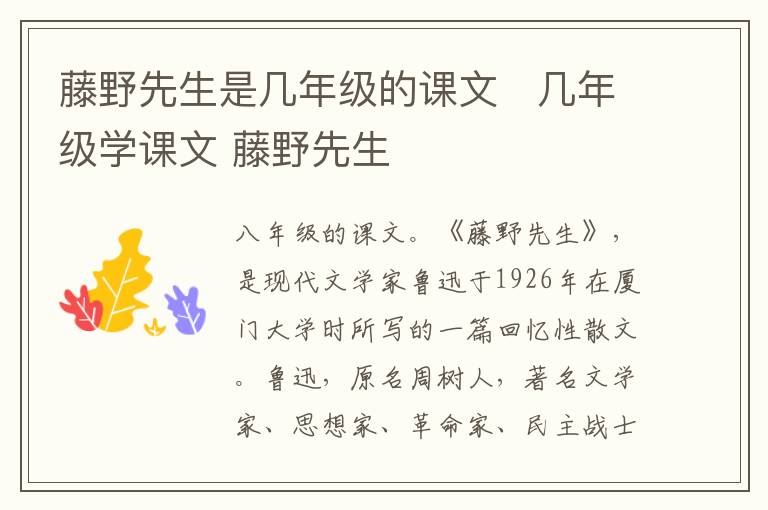 《藤野先生》,是现代文学家鲁迅于1926年在厦门大学时所写的一篇回忆性散文。鲁迅,原名周树人,著名文学家、思想家、革命家、民主战士,五四新文化运动的重要参与者,中国现代文学的奠基者。