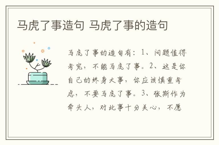 马虎了事的造句有:1、问题值得考究,不能马虎了事。2、这是你自己的终身大事,你应该慎重考虑,不要马虎了事。3、张斯作为牵头人,对此事十分关心,不愿马虎了事。