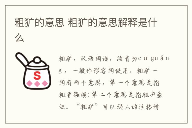 ,一般作形容词使用。粗犷一词有两个意思,第一个意思是指粗鲁强横;第二个意思是指粗率豪放。“粗犷”可以说人的性格特征,也可以说一个地方的环境风俗面貌,有种大气磅礴的意思,如自然生长般未经修饰,属豪放派的。词语出自《北史·耿豪传》:“豪少粗犷,有武艺,好以气陵人。”