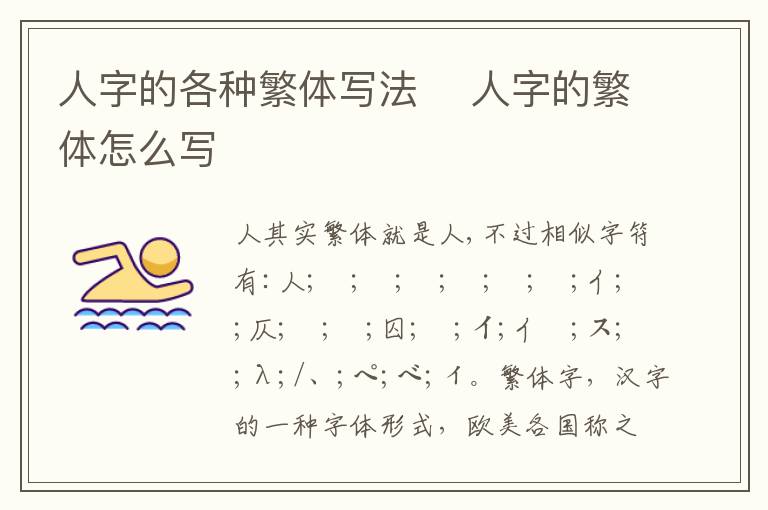 人其实繁体就是人,不过相似字符有:人;秂;魜;亽;亼;仌;朲;亻;亾;仄;仒;乆;囚;込;イ;亻亼;ス;罖;λ;/、;ぺ;べ;ィ。繁体字,汉字的一种字体形式,欧美各国称之为“传统中文”,一般是指汉字简化运动被简化字所代替的汉字,有时也指汉字简化运动之前的整个汉字楷书、隶书书写系统。繁体中文已有两千年以上的历史,直到1956年前一直是各地华人中通用的中文的标准字。