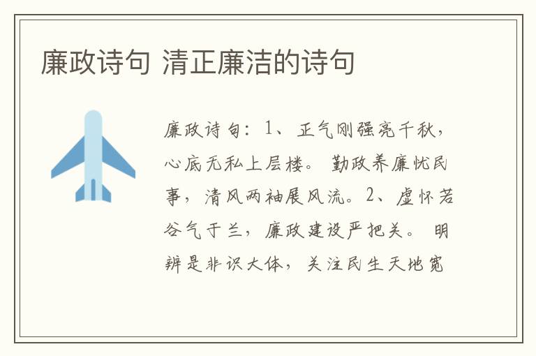 廉政诗句:1、正气刚强亮千秋,心底无私上层楼。 勤政养廉忧民事,清风两袖展风流。2、虚怀若谷气于兰,廉政建设严把关。 明辨是非识大体,关注民生天地宽。3、一片丹心日月明,绿灯昭扬百业兴。力促科技拓新路,引领群众奔康程。4、遵纪守法勤为民,率先垂范廉风生。 促进经济大发展,真抓实干拓新程。