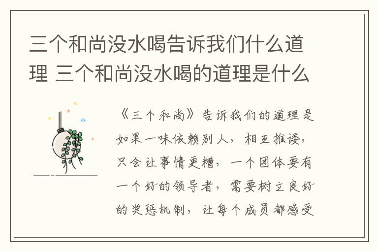 《三个和尚》告诉我们的道理是如果一味依赖别人,相互推诿,只会让事情更糟,一个团体要有一个好的领导者,需要树立良好的奖惩机制,让每个成员都感受到更多的价值和责任。没水喝的原因:只有一个和尚时,由于生存的需要,没有逃避的可能性,只有自己去挑水。同样的道理,当你让某个人全权负责某项事情,他没有丝毫推卸的余地,往往及时甚至提前完成任务,圆满解决问题。