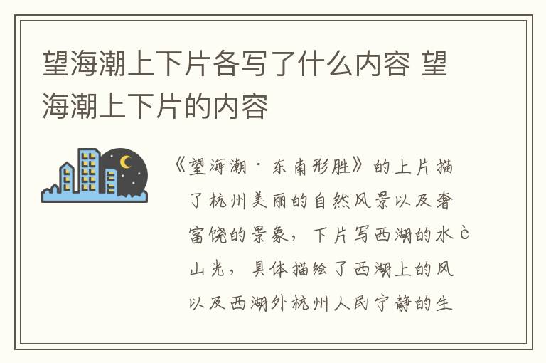 《望海潮·东南形胜》的上片描写了杭州美丽的自然风景以及奢华富饶的景象,下片写西湖的水色山光,具体描绘了西湖上的风光以及西湖外杭州人民和平宁静的生活景象,以此衬托出杭州的美丽与富庶。