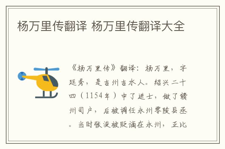 《杨万里传》翻译:杨万里,字廷秀,是吉州吉水人。绍兴二十四(1154年)中了进士,做了赣州司户,后被调任永州零陵县丞。当时张浚被贬谪在永州,正比们辞客,杨万里三次前往请教都见不到,写信尽力请求才得以被召见。张浚用使心意正直诚恳的学问(即儒家中庸之学)教导勉励她。杨万里(立志)一生都服从他的教诲,于是把书斋命名为“诚斋”。