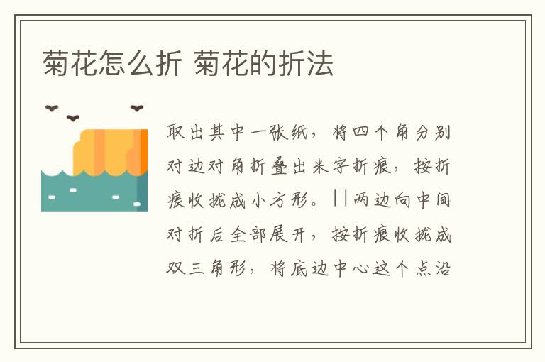 菊花怎么折 菊花的折法 知识分享 10月4日 编辑 童画 取消关注 关注 私信 1、取出其中一张纸,将四个角分别对边对角折叠出米字折痕,按折痕收拢成小方形。 2、两边向中间对折后全部展开,按折痕收拢成双三角形,将底边中心这个点沿着折痕往上翻折。 3、再将两侧的两条边向中间合拢,其他面同样方法,剩下两张方形纸也折出同样部件。 4、涂上胶水后固定好三个部件,将每个小角打开折出花瓣形状。 No related posts. 本文内容由互联网用户自发贡献,该文观点仅代表作者本人。本站仅提供信息存储空间服务,不拥有所有权,不承担相关法律责任。如发现本站有涉嫌抄袭侵权/违法违规的内容, 请发送邮件至 2245678901@qq.com 举报,一经查实,本站将立刻删除。 给TA打赏 共{{data.count}}人 人已打赏