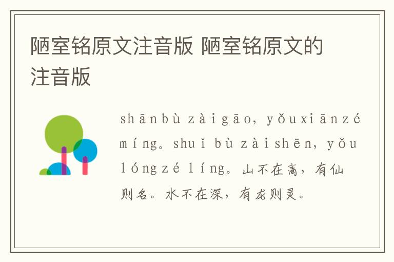 《陋室铭》原文注音版:shān bù zài gāo ,yǒu xiān zé míng。shuǐ bù zài shēn,yǒu lóng zé líng 。山不在高,有仙则名。水不在深,有龙则灵。