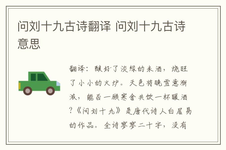翻译:酿好了淡绿的米酒,烧旺了小小的火炉。天色将晚雪意渐浓,能否一顾寒舍共饮一杯暖酒?《问刘十九》是唐代诗人白居易的作品。全诗寥寥二十字,没有深远寄托,没有华丽辞藻,字里行间却洋溢着热烈欢快的色调和温馨炽热的情谊,表现了温暖如春的诗情。