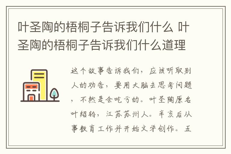 这个故事告诉我们,应该听取别人的劝告,要用大脑去思考问题,不然是会吃亏的。叶圣陶原名叶绍钧,江苏苏州人。辛亥后从事教育工作并开始文学创作。五四运动前后投身新文学运动,参与发起组织文学研究会。抗战时入川,曾发起成立文艺界抗敌后援会。