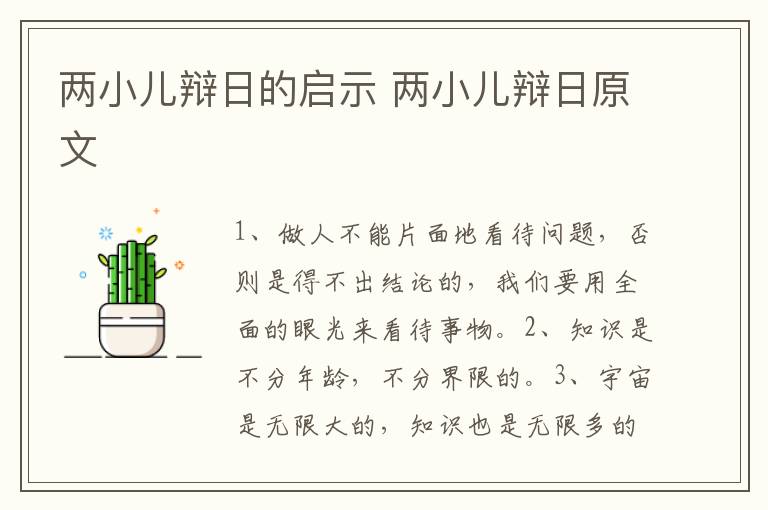 1、做人不能片面地看待问题,否则是得不出结论的,我们要用全面的眼光来看待事物。2、知识是不分年龄,不分界限的。3、宇宙是无限大的,知识也是无限多的,学无止境。即便是博学的孔子也会有所不知,所以我们要不断学习。4、知之为知之,不知为不知。“不要强不知以为知”。