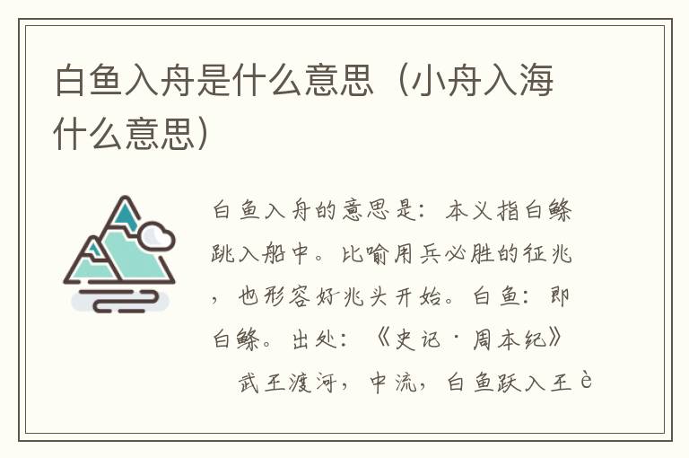 白鱼入舟的意思是:本义指白鲦跳入船中。比喻用兵必胜的征兆,也形容好兆头开始。白鱼:即白鲦。出处:《史记·周本纪》:武王渡河,中流,白鱼跃入王舟中,武王俯取以祭,诸侯皆曰:纣可伐矣。