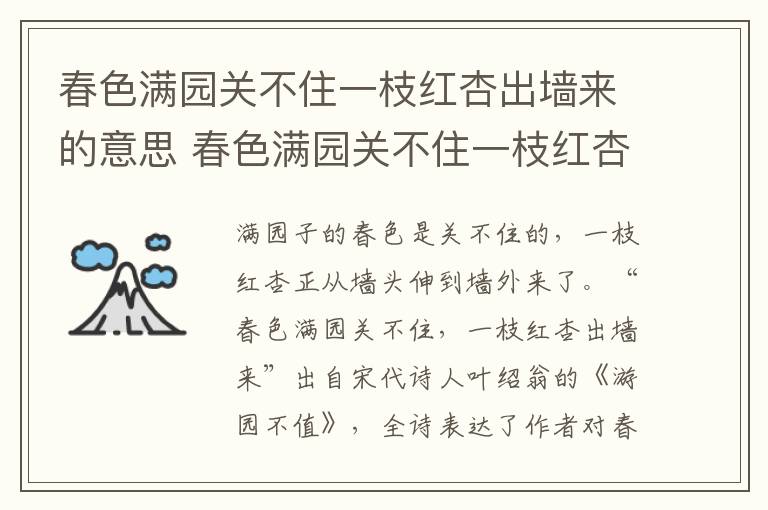 “春色满园关不住,一枝红杏出墙来”的意思是:满园子的春色是关不住的,一枝红杏正从墙头伸到墙外来了。“春色满园关不住,一枝红杏出墙来”出自宋代诗人叶绍翁的《游园不值》,全诗表达了作者对春天的喜爱之情。