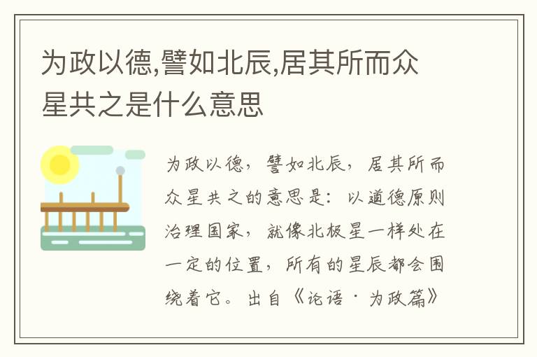为政以德,譬如北辰,居其所而众星共之的意思是:以道德原则治理国家,就像北极星一样处在一定的位置,所有的星辰都会围绕着它。出自《论语·为政篇》,《为政》包括24章,主要内容涉及孔子为政以德的思想、如何谋求官职和从政为官的基本原则、学习与思考的关系、孔子本人学习和修养的过程、温故而知新的学习方法,以及对孝、悌等道德范畴的进一步阐述。