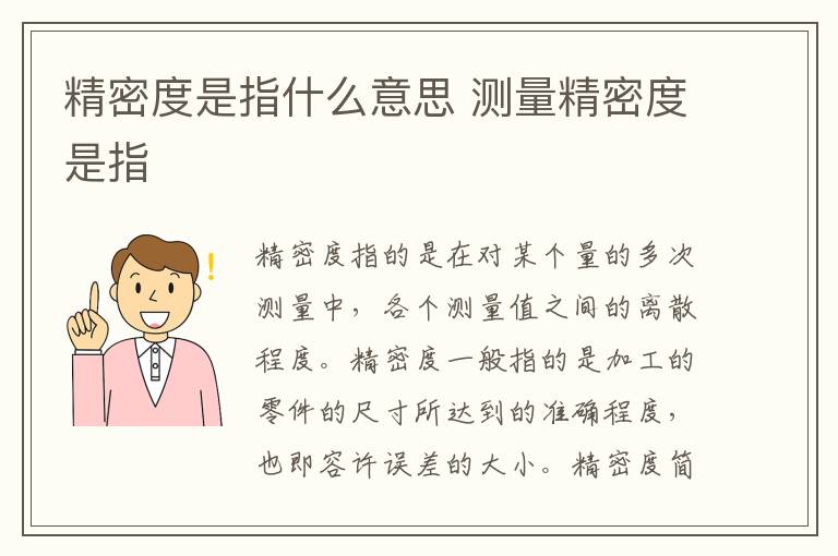 精密度指的是在对某个量的多次测量中,各个测量值之间的离散程度。精密度一般指的是加工的零件的尺寸所达到的准确程度,也即容许误差的大小。精密度简称精度,表示测量的再现性。