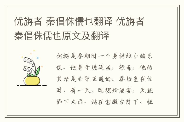 优旃者,秦倡侏儒也。善为笑言,然合于大道。秦始皇时,置酒而天雨,陛楯者皆沾寒。优旃见而哀之,谓之曰:“汝欲休乎?”