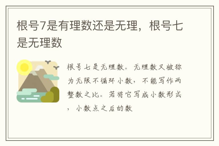 根号七是无理数。无理数又被称为无限不循环小数,不能写作两整数之比。若将它写成小数形式,小数点之后的数字有无限多个,并且不会循环。