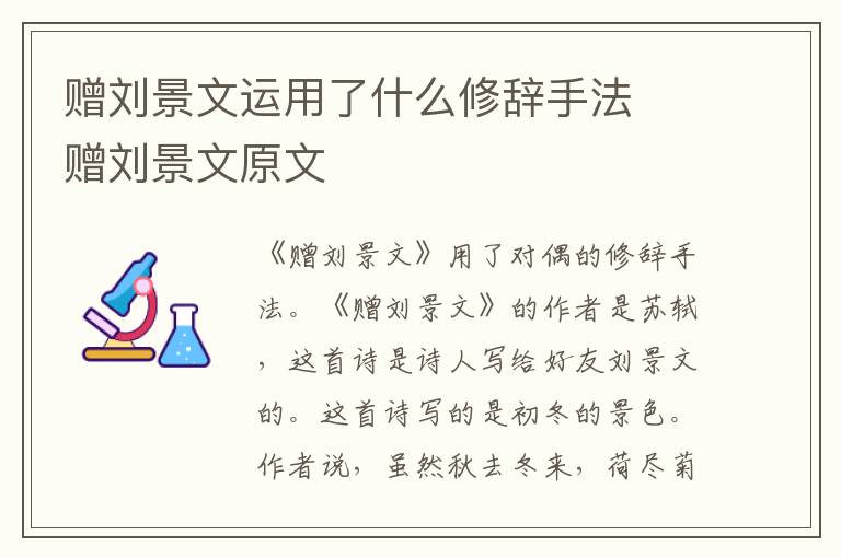 《赠刘景文》用了对偶的修辞手法。《赠刘景文》的作者是苏轼,这首诗是诗人写赠给好友刘景文的。这首诗写的是初冬的景色。作者说,虽然秋去冬来,荷尽菊残,但仍是橙黄橘绿的美好时光。诗中用“傲霜枝”作比,意在歌颂刘景文孤高傲世的高洁品格。“菊残犹有傲霜枝”,后来有人借用它比喻坚贞不屈的人。