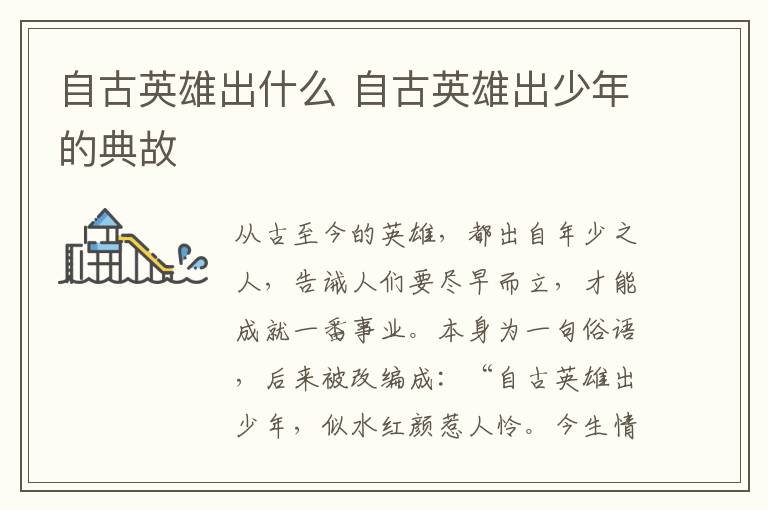 “自古英雄出少年”的意思:从古至今的英雄,都出自年少之人,告诫人们要尽早而立,才能成就一番事业。本身为一句俗语,后来被改编成:“自古英雄出少年,似水红颜惹人怜。今生情尽空悲切,来生再续未了缘”。这首诗改编自电视剧《仙剑奇侠传》。