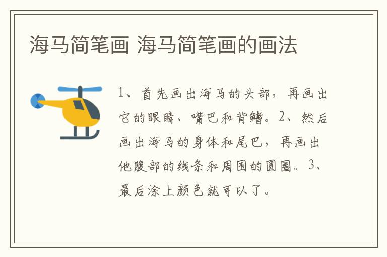 海马简笔画 海马简笔画的画法 知识分享 23年2月8日 编辑 童画 取消关注 关注 私信 1、首先画出海马的头部,再画出它的眼睛、嘴巴和背鳍。 2、然后画出海马的身体和尾巴,再画出他腹部的线条和周围的圆圈。 3、最后涂上颜色就可以了。 No related posts. 本文内容由互联网用户自发贡献,该文观点仅代表作者本人。本站仅提供信息存储空间服务,不拥有所有权,不承担相关法律责任。如发现本站有涉嫌抄袭侵权/违法违规的内容, 请发送邮件至 2245678901@qq.com 举报,一经查实,本站将立刻删除。 给TA打赏 共{{data.count}}人 人已打赏