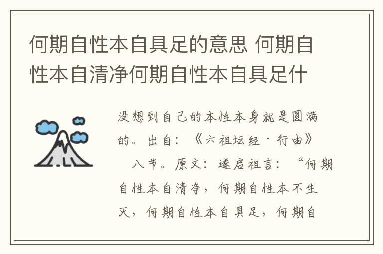 没想到自己的本性本身就是圆满的。出自:《六祖坛经·行由》第八节。原文:遂启祖言:“何期自性本自清净,何期自性本不生灭,何期自性本自具足,何期自性本无动摇,何期自性能生万法。”释义:慧能对五祖说:“没想到自己的本性原来清净,没想到自己的本性原来就不生也不灭,没想到自己的本性本身就是圆满的,没想到自己的本性原就是坚定不移的,没想到自己的本性就能产生万事万物。”