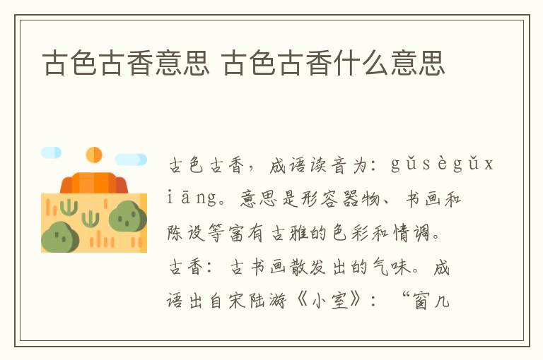 古色古香,成语读音为:gǔsègǔxiāng。意思是形容器物、书画和陈设等富有古雅的色彩和情调。