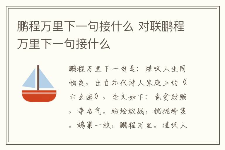 鹏程万里下一句是:堪叹人生同物类,出自元代诗人朱庭玉的《六幺遍》,全文如下:竟贪财贿,争名气。纷纷蚁战,扰扰蜂集。鸠巢一枝,鹏程万里。堪叹人生同物类,何异,幻躯白甚苦驱驰。译文:人们都去贪财受贿,为了争夺更大的名誉。匆忙的样子像是蚂蚁在活动。不如像鸠一样把自己的住处放在远一些的树枝头,或者像大鹏一样前程远大。于是感叹人生来就如同动物一样,那这样有有什么不同呢,把自己的身躯苦苦的忙碌奔波。